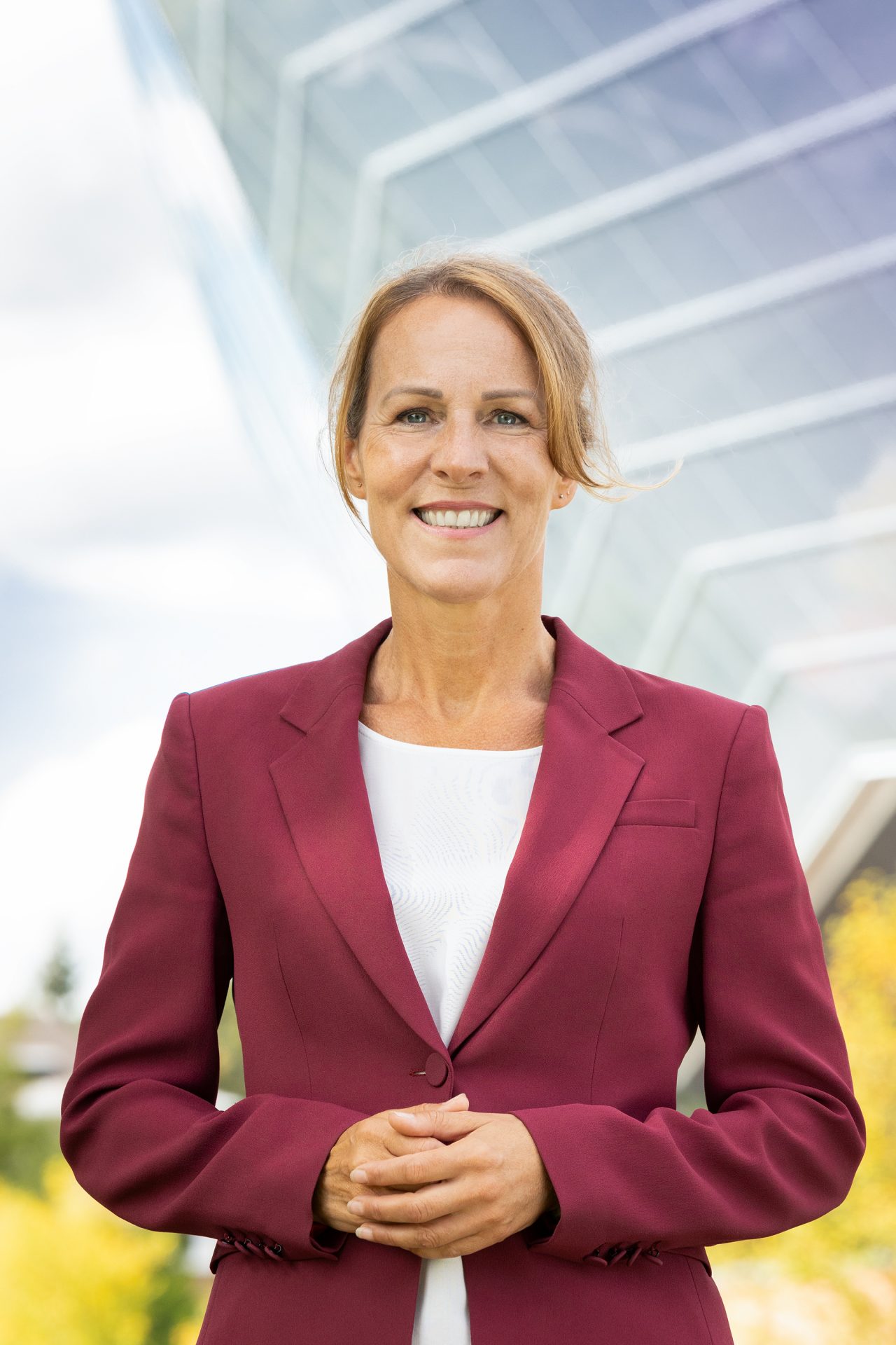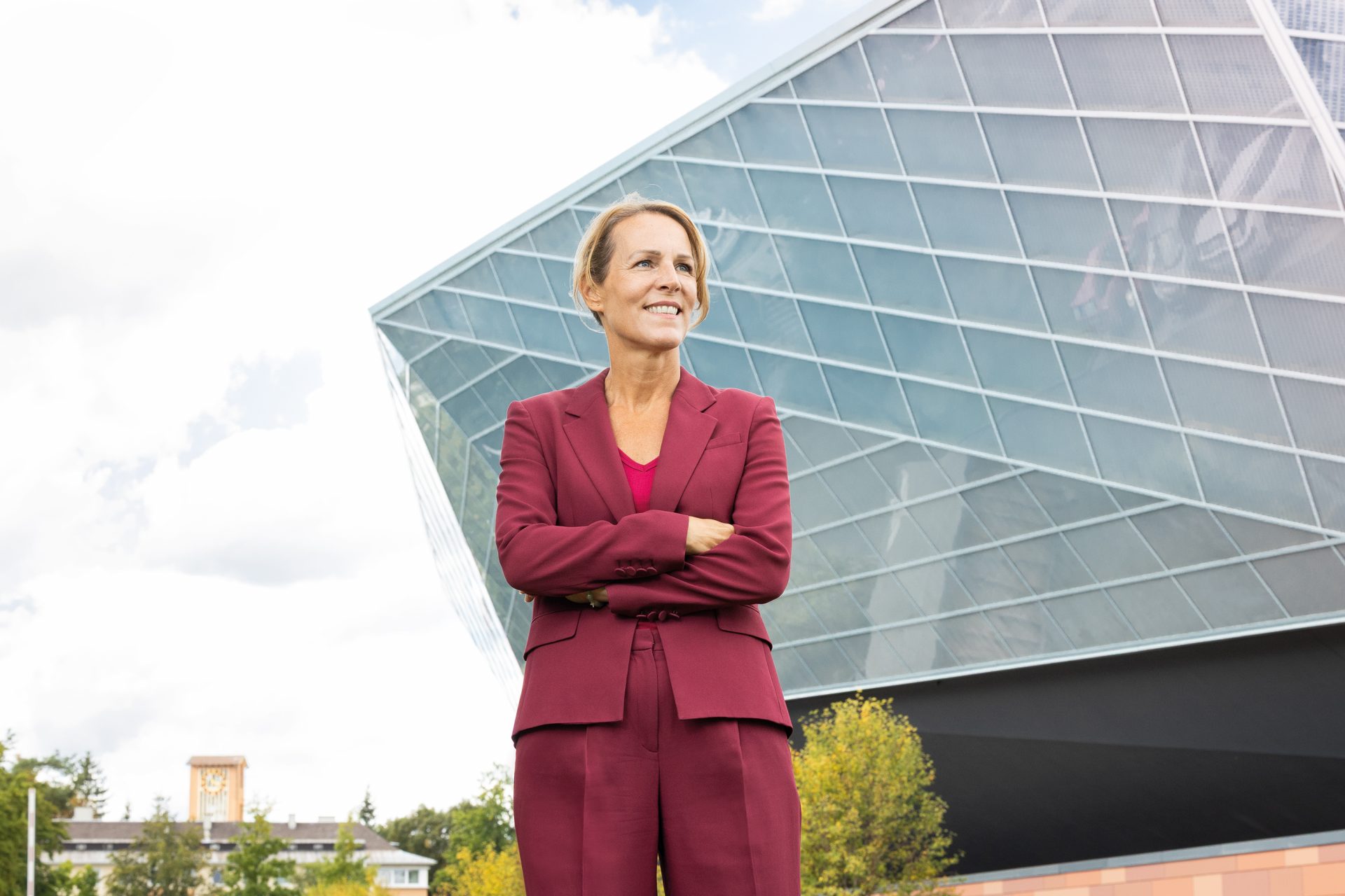 Eine Frau - Eva Döhla - in einem roten Hosenanzug vor einer modernen Halle.